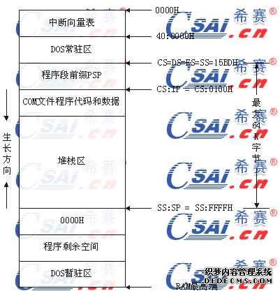建立PSP后,MS-DOS在PSP的后面立即开始(偏移100H)加载COM文件,它置SS、DS和ES为PSP的段地址,接着创建一个堆栈。